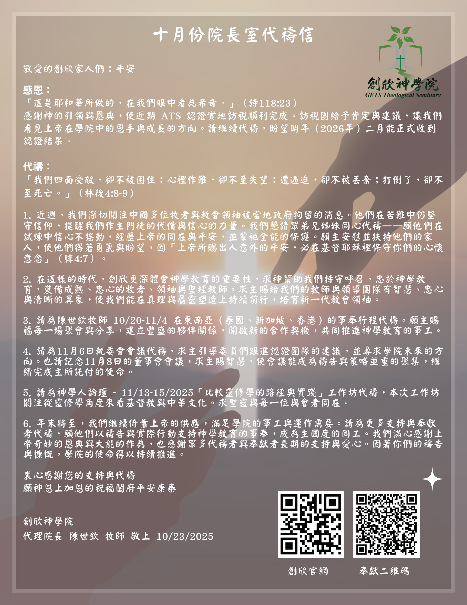 As a learning community of Chinese-speaking Christians, GETS Theological Seminary equips individuals to serve Jesus Christ effectively in ecclesiastical and educational ministries worldwide, by contextualizing and contemporizing biblical and theological teachings.